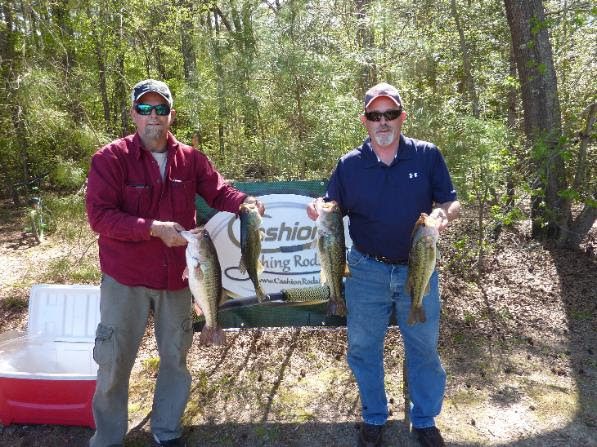 A beautiful day for the 41 boats fishing the Cashion Fishing Rods Spring Team Tournament Bass Trail Qualifier #4 at Kerr Lake. The weather was very nice for April with winds very light in the am and up to 7 mph in the afternoon, the air temps ranged from 33 to 69 and the water level was about 2′ high and in the bushes! Surface water temps averaged 57 degrees and the water was fairly clear! The bite was a little tough with the cold front causing most of the problem. The fish are just starting the spawn and were caught in mostly 1 to 10′ of water. With the warm weather forecasted in the coming week the spawn should begin!
