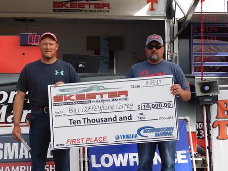 Bill Coffey (Maynardville, TN) and Eddie Coffey (Knoxville, TN) held off the 2nd place team with a weight of 17.61 receiving the 1st place check of $10,000.00 in addition to Highest Finishing Lowrance $500.00 for total winnings of $10,500.00.