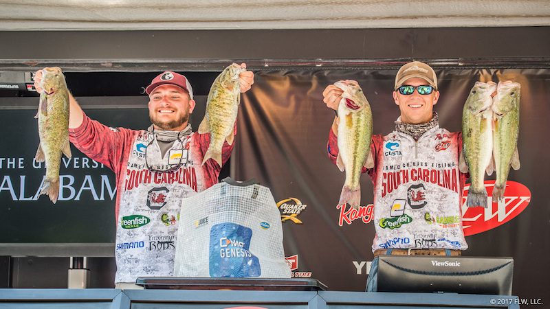 FLORENCE, Ala. (May 31, 2017) – The University of South Carolina team of Patrick Walters of Summerville, South Carolina, and Gettys Brannon of Gaffney, South Carolina, took the early lead Wednesday after Day One of the 2017 YETI FLW College Fishing National Championship on Wheeler Lake presented by Lowrance C-Map Genesis. The Gamecock duo weighed a five-bass limit totaling 17 pounds, 3 ounces and will begin Day Two with an 8-ounce lead over the second place team from Tennessee’s Bethel University.