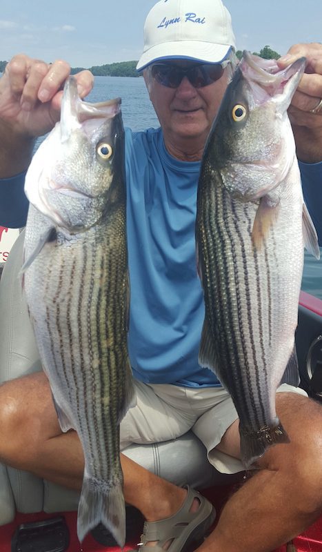 Picture: Phil Christopher from Greensboro, NC with 2 nice stripers caught 7/26/17 while fishing with Captain Dale.
