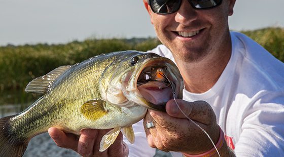 That being said, Walking Frogs of both sizes can be fished around cover other than grass. Overhanging trees are among DeFoe’s other favorite targets. “There’s a lot cooler water under those overhanging trees, but it’s very difficult to get a bait in there to them if you can’t skip it. But a Terminator Frog, you can skip really well,” says DeFoe.