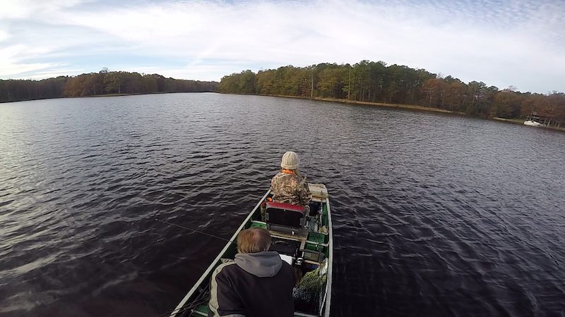 The weather had been up and down, high on Thursday was in the 60s. Friday in the 50s, and Saturday was supposed to be in the 60s again. But the high at 7 am was 30 degrees and the wind was a true force. We launched the boat and proceeded to the deepest part of the pond at the dam. The depth finder showed some really nice bass were holding along the bottom, but the wind blew us off them before we could even blink. Back on the trolling motor we go, going past them and then dropping an anchor in 17 feet of water. We worked a lipless crankbait along the bottom in every direction, but nothing. We worked deep diving crankbaits along the bottom, spinnerbaits, suspending jerkbaits, a jig n’ pig, soft plastics, everything, but nothing was working. What were we doing wrong?
