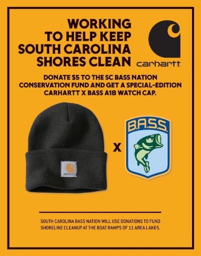 Fans attending the 2018 Bassmaster Classic are encouraged to stop by the Carhartt booth, located next to the Skeeter Boats booth, for a chance to show their love of bass fishing and cleaner waterways by supporting the initiative to clean up South Carolina fisheries — and walk away with a limited edition Carhartt B.A.S.S. cap.