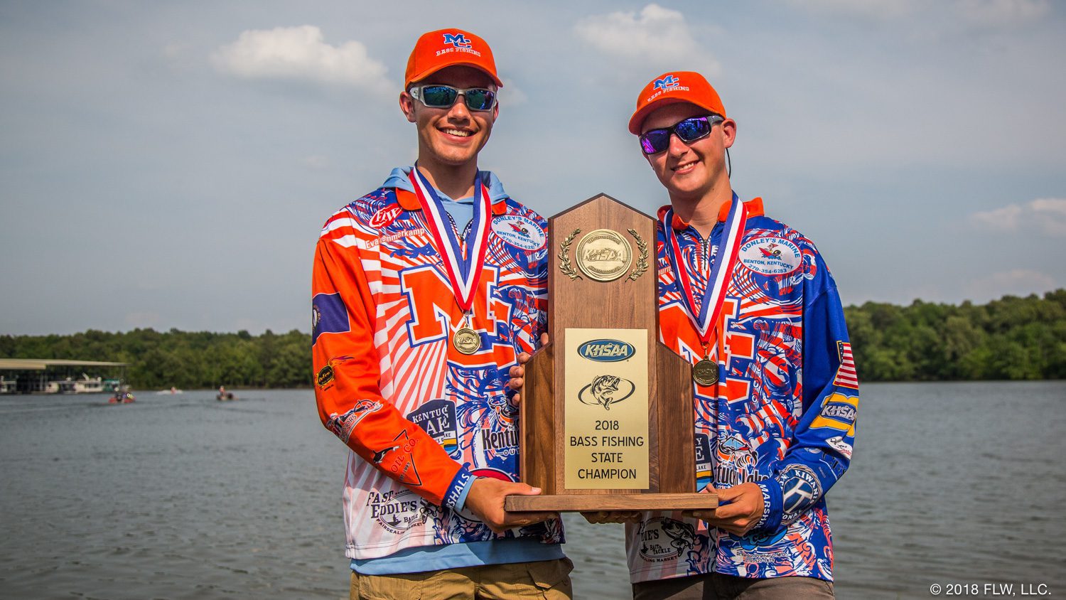GILBERTSVILLE, Ky. (May 14, 2018) – The Marshall County High School team of Tristan Barrett and Evan Bremmerkamp brought a two-day cumulative total of eight bass weighing 27 pounds, 11 ounces to the scale this weekend, beating out 67 other teams to win the 2018 Kentucky High School Athletic Association (KHSAA) State Bass Fishing Championship on Kentucky Lake. The win earned the team medals, a trophy to display in their school and the title of KHSAA state champions.