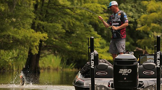 While that decision didn’t pay off immediately – Swindle was still in 32nd place after the first two days of the four-day tournament, and in 10th place heading into Championship Sunday – it was a difference maker, propelling him to success in conditions most pros agreed was very tough. The Sabine River system challenged anglers with brackish water (a mix of seawater and freshwater), tidal water-level fluctuations, and a population of more small bass than big ones. Additionally, conditions were uncomfortably hot for man and bass alike. Water temps were in the 90s for much of the tournament, before dropping to near 80 degrees for the final day.