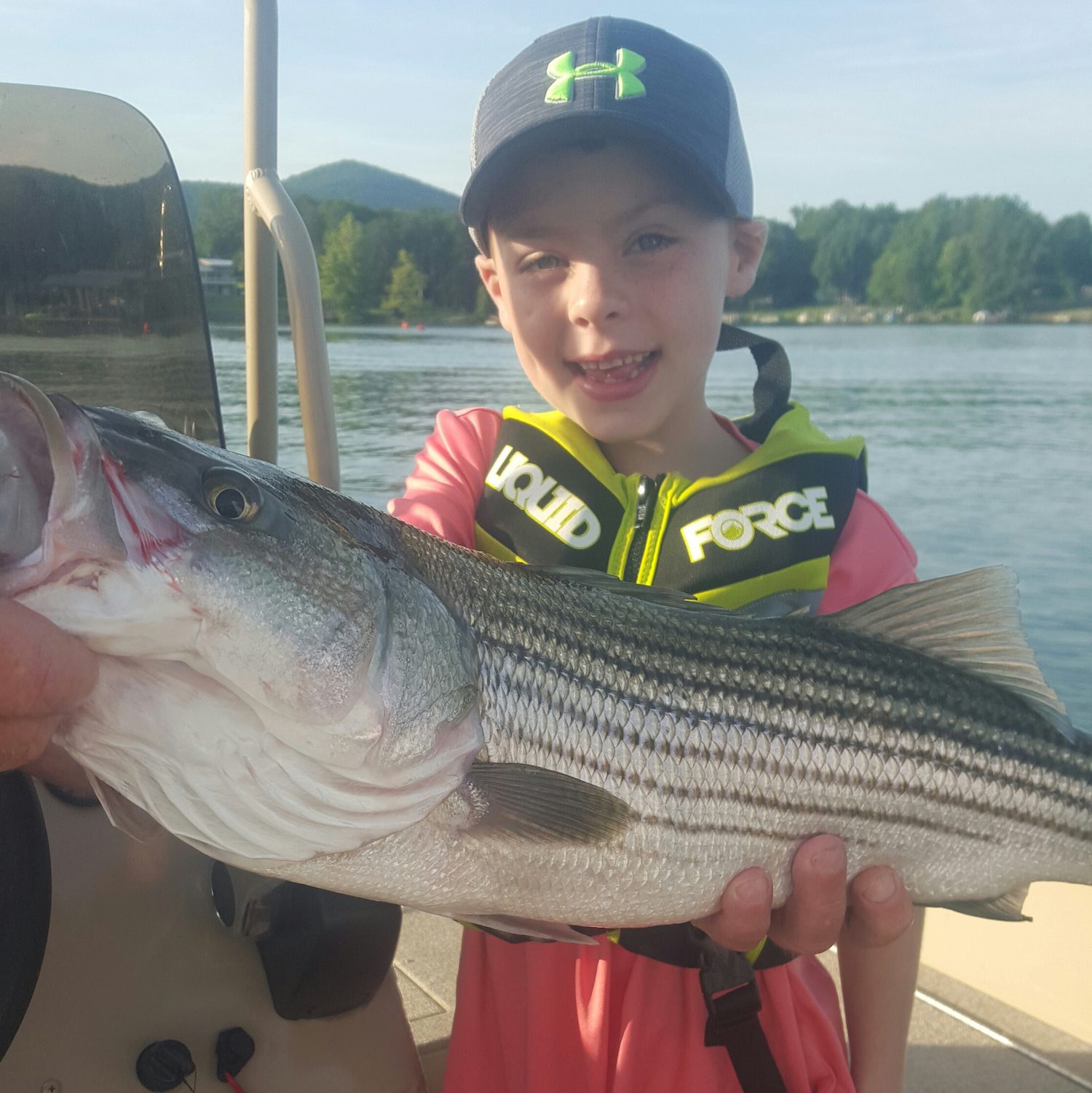 Picture: Colin Elder 7 yrs. old from Brookneal, Va., with his first striper that was caught & released in September, while fishing with his grandfather John Mason and Captain Dale.