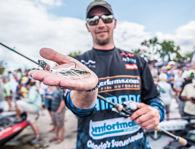 Gustafson shares his secret weapon—a ChatterBait JackHammer— during a 2018 FLW Tour event.” (Photo by Charles Waldorf) |