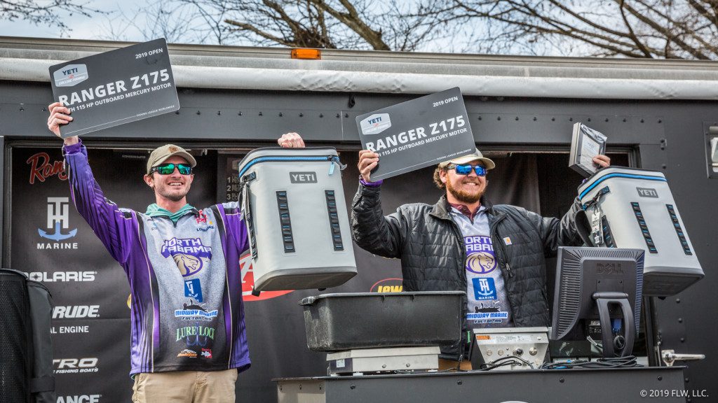 GILBERTSVILLE, Ky. (March 14, 2019) – The University of North Alabama team of Hunter McCarty of Dora, Alabama, and Sloan Pennington of Childersburg, Alabama, won the fifth-annual YETI FLW College Fishing Open on Kentucky and Barkley lakes Wednesday with a two-day cumulative total of 10 bass weighing 45 pounds, 14 ounces. The victory earned the duo a $27,400 prize package, including a new Ranger Z175 boat with a 115-horsepower outboard, and a slot in the 2020 FLW College Fishing National Championship.