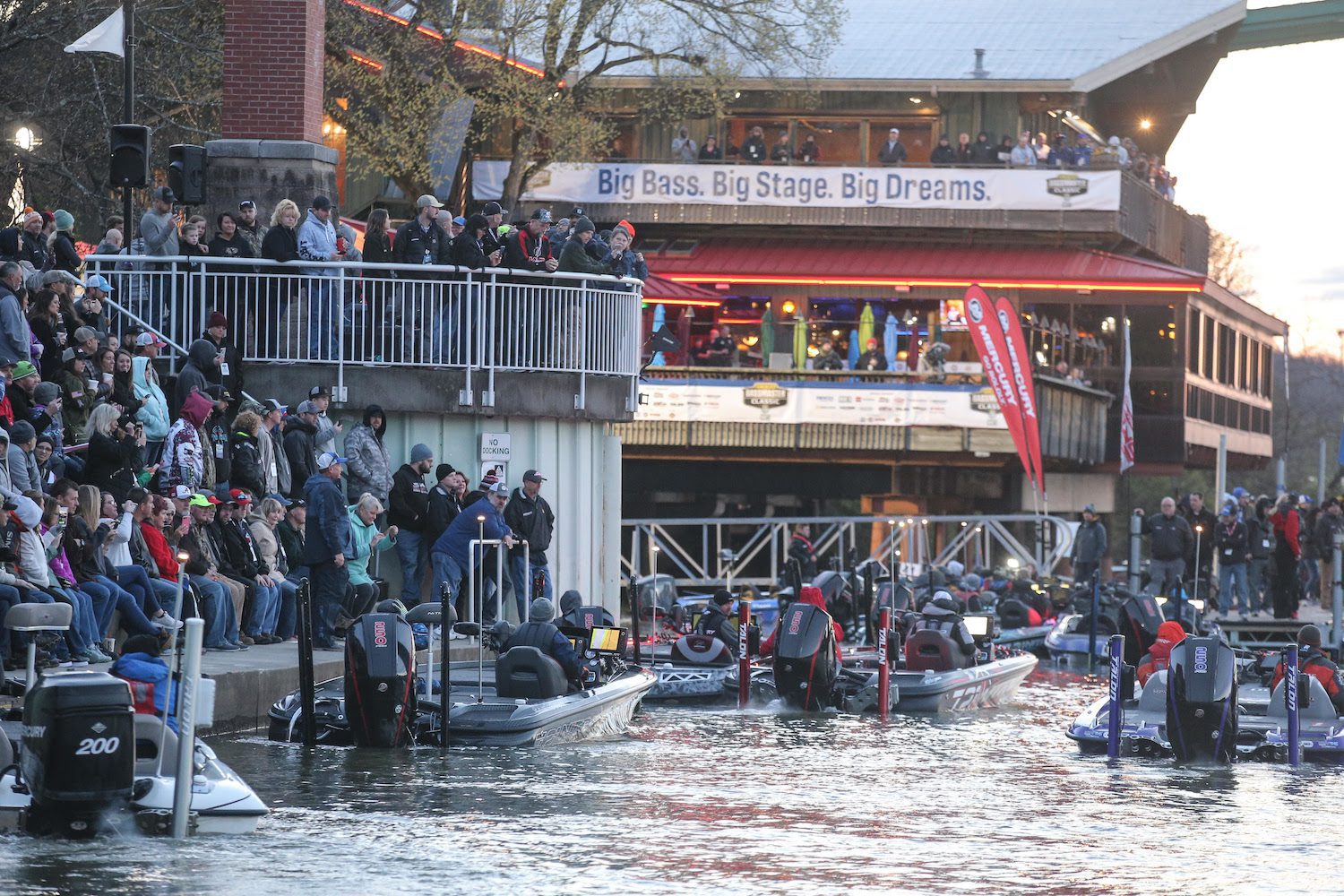 As many as 6,500 people crowded Volunteer Landing on the Tennessee River to watch takeoff processions as anglers began their competition days in the 49th Bassmaster Classic.