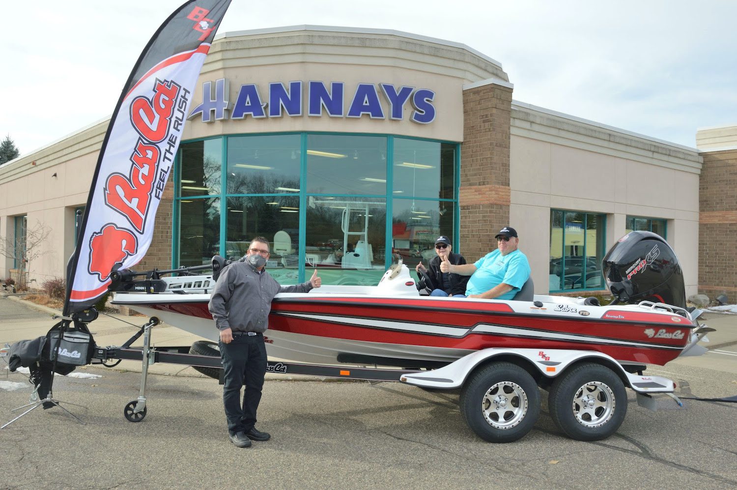 Tom and Joan Campbell of Fairmont, Minn., winners of the Bassmaster “Fish with Hank Cherry” sweepstakes, receive their new Bass Cat Sabre with Mercury engine at Hannay’s Marine in Minneapolis.