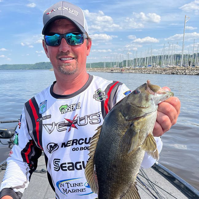 According to Mehr, the section of river he chose to work had fish in all three stages of the spawn. “I love to target post-spawn smallmouths when they set up on rip-rap, so I was mostly fishing shallow with a Bagley Balsa B1 Squarebill Crankbait. That lure runs shallow, isn’t easy to hang, and draws ferocious strikes when you bang it off rocks. It ended up playing a big part in my success as the bite came alive from the bank out to four-foot depths during the afternoon hours. Anytime I get in a situation where that approach is going to come into play, I know my chances are really good because I’ll have a Bagley crankbait at the end of my line. The saying really is true: ‘balsa is better!’” While Mehr had his fish right where he wanted them during the afternoon, Bagley pro staffer, Tony Hatten, 48, from Richmond, Minnesota, found the fish more skittish than during his practice sessions when he hit the water for game day. Adjusting on the fly to quickly dropping water levels, he managed to claw his way to tenth place with a very respectable 32 pounds, 15 ounces of Mississippi bronzebacks. |