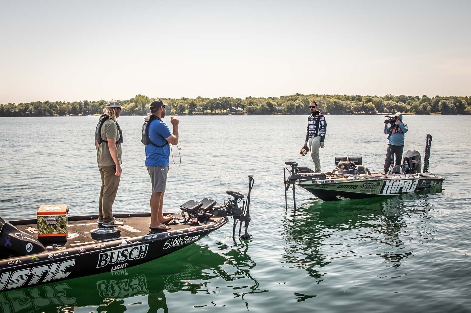 Bassmaster Elite Series anglers Matt Robertson and Lee Livesay, who did not make the final day cut, exchange boats with fellow pro Bob Downey (right) during Championship Sunday at last weekend’s Guaranteed Rate Bassmaster Elite at the St. Lawrence River.