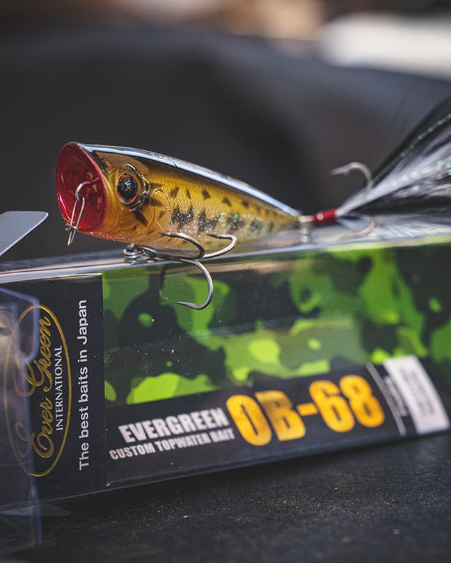 “That makes 9 patterns in all for this super popper,” says Marc Mills, senior marketing manager at Daiwa. “We’ve got all the bases covered so that anglers can match up an Ever Green 0B-68 popper to any water condition or baitfish species they come across. That versatility means you can swap out pattens at a moment’s notice if you discover the bass shifting their preference to a different type of baitfish and make your popper stand out to provoke strikes from fish searching for something a little different, or to match changing skies or water clarity. The possibilities are endless.” Colors are important, but so is a lure’s complete design when it comes to surface fishing, which helps explain how the Ever Green OB-68 sees so much success. Designed to “spit, bubble and pop” in response to every twitch of the rod tip, this unmatched topwater popper features a sharp-edged face cup that produces both strong and weak splashing sounds, catering to varying surface conditions. A perfectly balanced body yields tangle-free, arrow-straight casts, as well as steadiness on the surface, whether chugged rapidly or languidly. Additional fish-provoking noise is generated by its tungsten, brass, steel and glass rattle weights. Each rattle pounds out a unique frequency, combining for a hybrid rattling sound with wide appeal. |