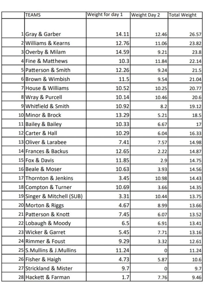 to them! 2nd place was the team of Williams & Kerns with a two day total of 23.82 pounds. They won day two and the two day overall 2nd place TWT’S pushing their total up to $2120.00. Day one’s leaders the team of Overby & Milam grabbed third place with a 2 day total of 23.80 pounds. They won day one 1st place TWT pushing them to $ 1630.00. Big fish was won by the team of Minor & Brock with a 6.09 pound fish earning them $600.00.