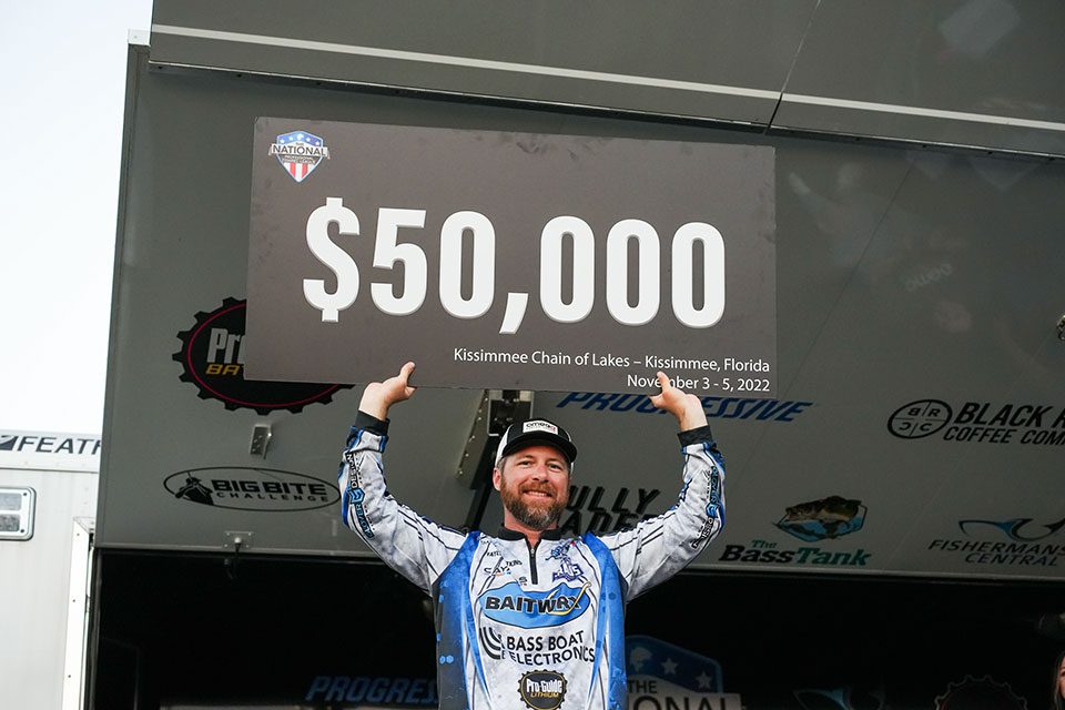 With a 28-pound, 11-ounce giant bag on day three, Taylor Watkins becomes a three-time NPFL Champion with his win on the Kissimmee Chain of Lakes. Watkins weighed in 23-pounds, 12-ounces on day one and 17-pounds, 7-ounces on day two to go along with his Showdown Saturday bag, giving him a three-day total of 69-pounds, 14-ounces.