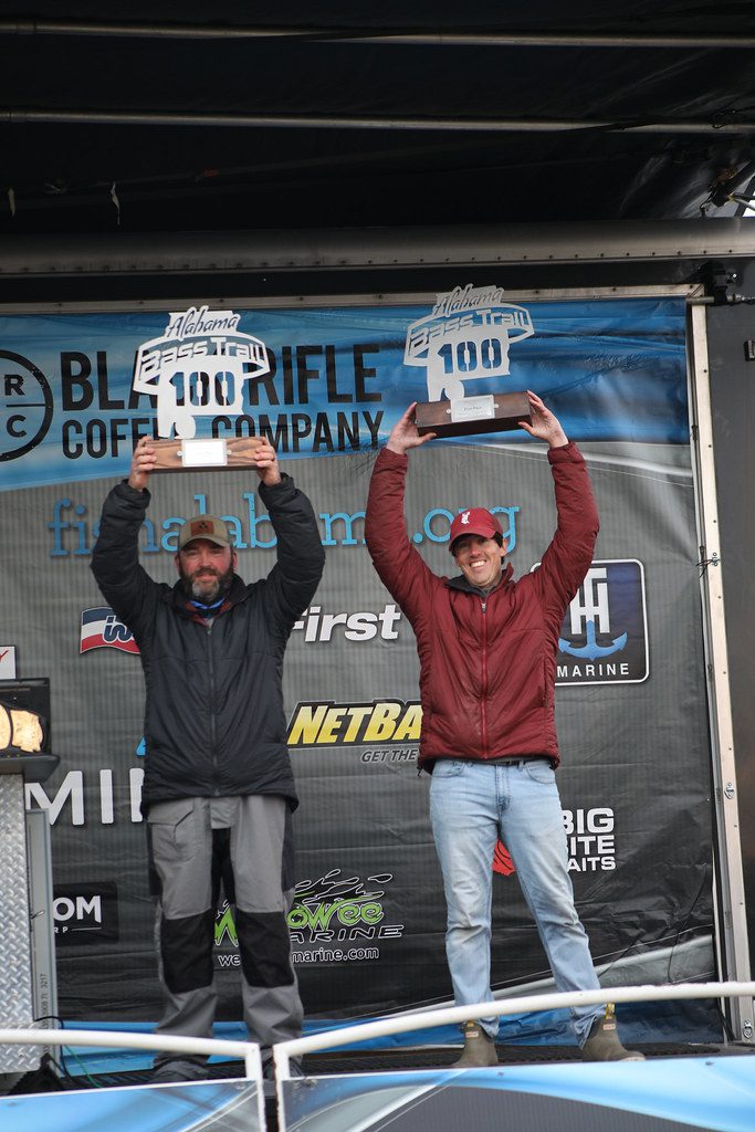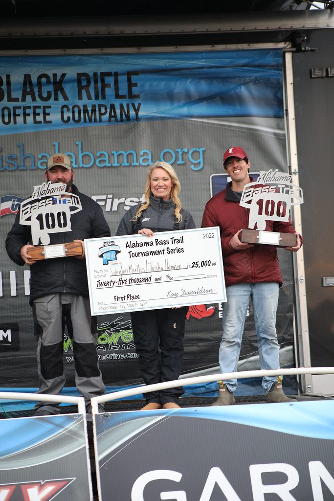 Florence, Ala November 19-The Alabama Bass Trail 100 Series concluded the 2022 season with the third and final stop at Pickwick Lake. 100 Teams competed for over $100,000 total purse. The final event also decided the AOY race. With teams reporting a difficult practice and few fish catches, the competition was expected to be tough. However, Pickwick has been known to produce heavy weights in previous ABT events, and this weekend didn’t disappoint. The team of Waylon Mullis and Justin Hammer crossed the scales with 25.03 pounds of Pickwick bass to take the win.