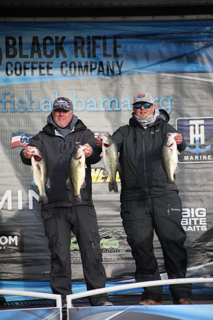 Jeff Kitchens and Randy Wiggins finished in second-place. “We started on the lower end of the lake on Thursday, and didn’t really find anything. On Friday, we spent our time on the upper end of the lake where we saw a bunch of birds flying around an area we didn’t fish. We spent our time fishing other areas not catching much, so we made a plan Friday night to start in the area where we saw the birds.” They described the spot as, “scattered grass and stumps along a long bar in the seven-mile island area” fishing within sight of the first-place team. “The area had some fresh new grass, and the current flowed by washing against a hard spot pushing the bait up just right for the fish to come up and feed out of the current.” Jeff and Randy said it was a “quick morning bite flurry.” They caught their fish using crankbaits- a Bill Lewis MR7 in white and a Lucky Craft square bill. The team weighed in 20.89 pounds of Pickwick bass giving them a second place and $12,500.