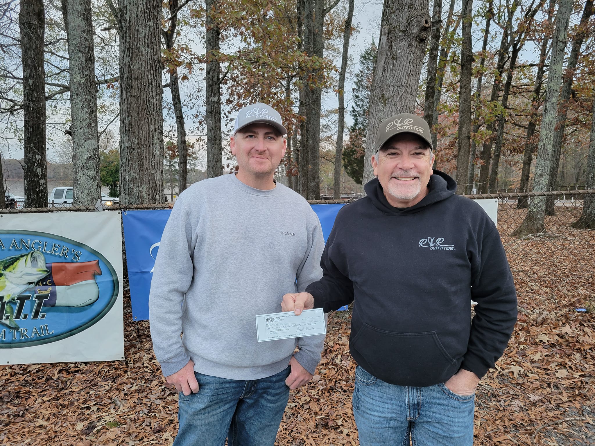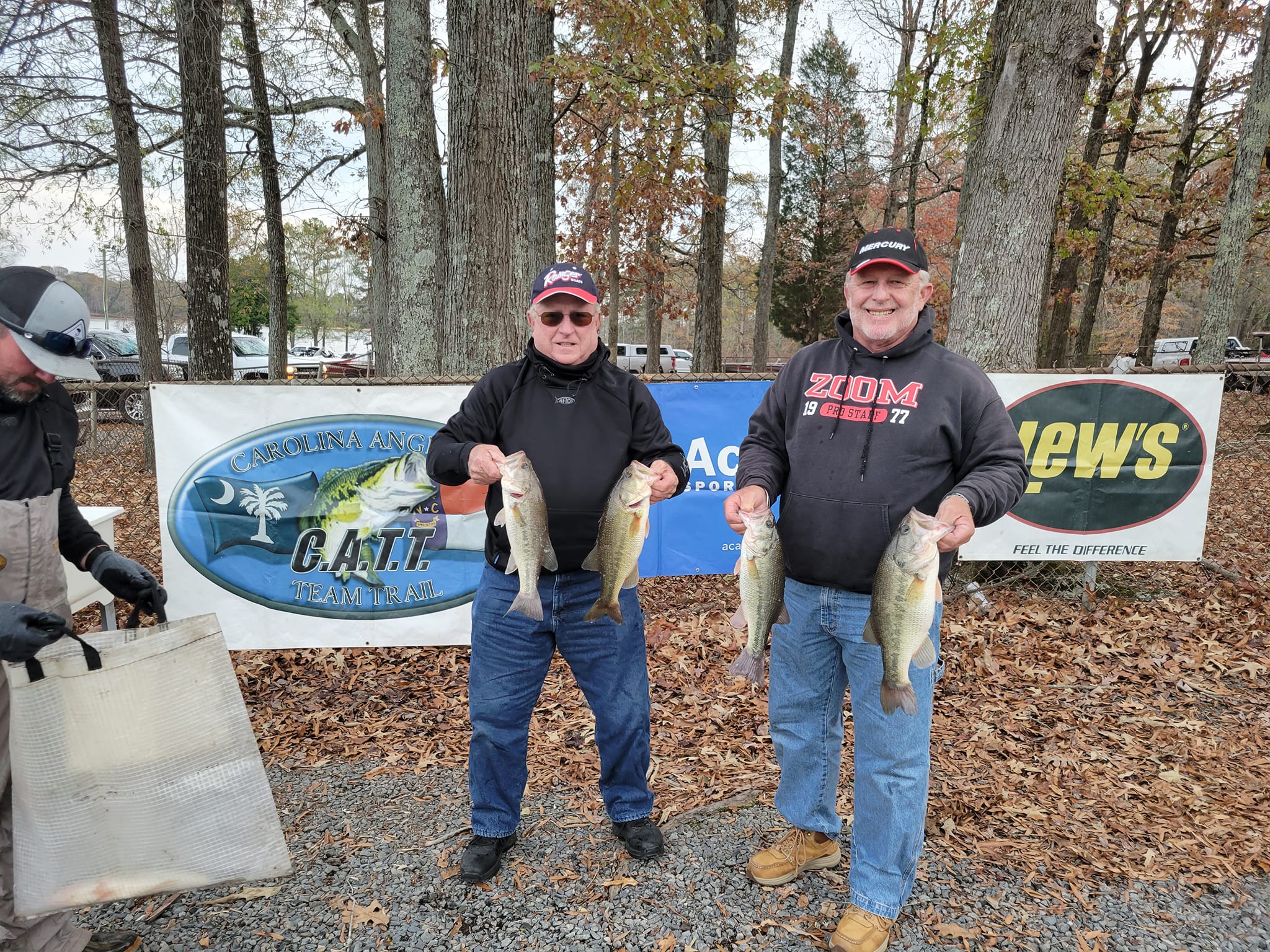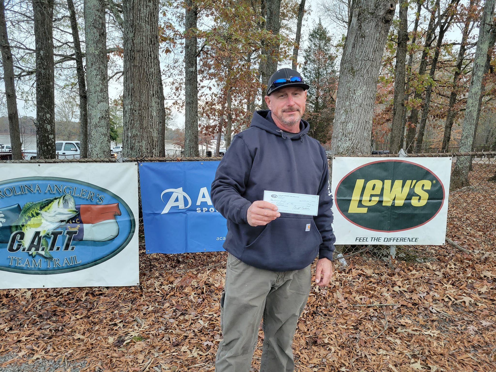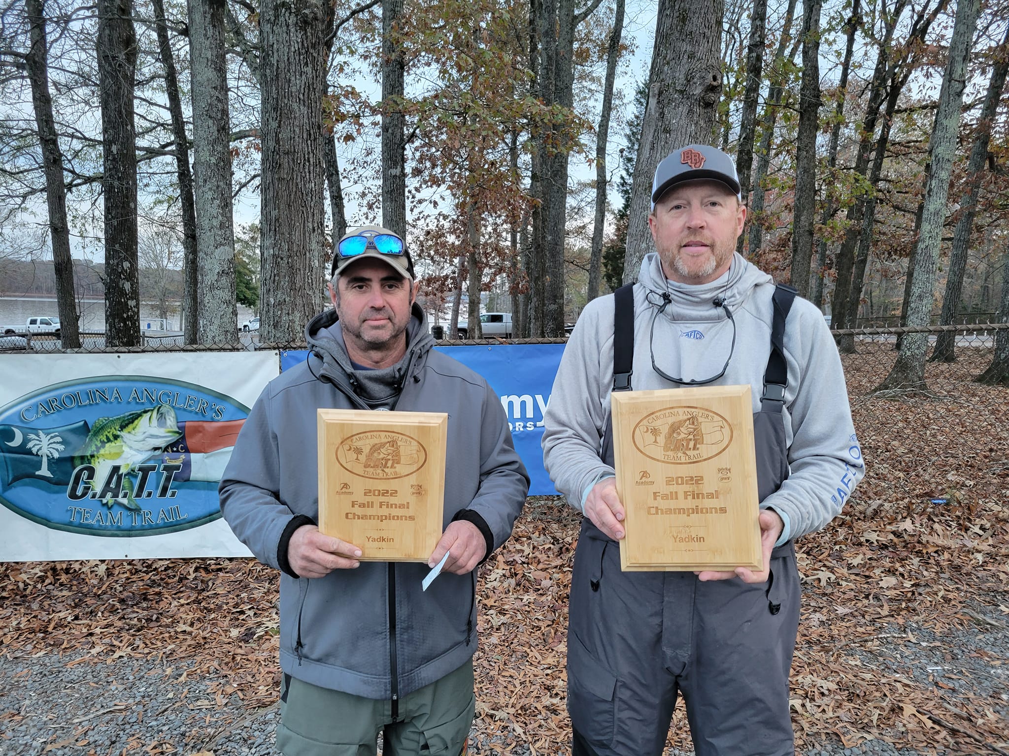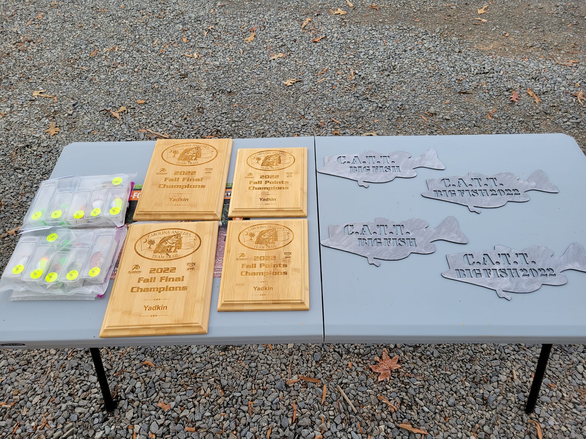 The Yadkin fall CATT Trail concluded today with the final event of 2022. The last several weeks have been tough for me mentally and physically, I hesitate to put personal things on this post, but I can’t help but to in this case. Earlier in the week I decided I would serve chicken chili at the weigh in, so I got the crockpots out and let them roll. While they were doing their thing, I decided to do some yard work and I found myself in the back yard with piles of leaves, trees and the sound of the wind running through the leaves that were still hanging on to the trees a little longer. In that moment I found peace, I could feel God’s presence and I was going to hang on a little while longer. A little time passes, and it was time to check on things inside and get ready to go pick up plaques for the final. As I was getting ready, I came across a hoodie that I hadn’t seen in over a year, my original CATT hoodie. A little older, a little beat up, and a little faded to most…but to me, filled with character, lots of memories, and very vibrant. So, what does this post mean…what does personal have to do with these results and CATT?? CATT is a part of who I am, an organization that I pride myself in being a part of. That old, faded hoodie was like a breath of fresh air and snapped me back to reality, the final was here, and it was show time. The fog delayed us just a bit this morning, but it did not slow down the team of Tod Haynes and Jeremy Talbert. The pair of anglers brought 25.36 lbs of bass to the scales this evening to sweep the board. 1st, 1st sidepot, and 1st big fish for a total of $3,250.00. They also took home the 1st place points Champs prize of $500.00 giving them a total purse on the day of $3,750.00. Thank you to all the anglers who fished with us this fall! Ladies and gentlemen when I say I love it, when I say I appreciate you, and when I say you are the ones that make it worth it. This right here is exactly what I mean. Congrats to all who placed today, and we look forward to seeing you all next year. Shout out to Marty Smith for the hard bait prize packs given out at esch event and also Nick Bashford with Ultra-Tech Tool and Machine for the awesome big fish trophy’s! Last but not least, Kari Murphy, Erik Myers, Carissa Smith thank you for all you do to help me. I truly couldn’t do it without you all!