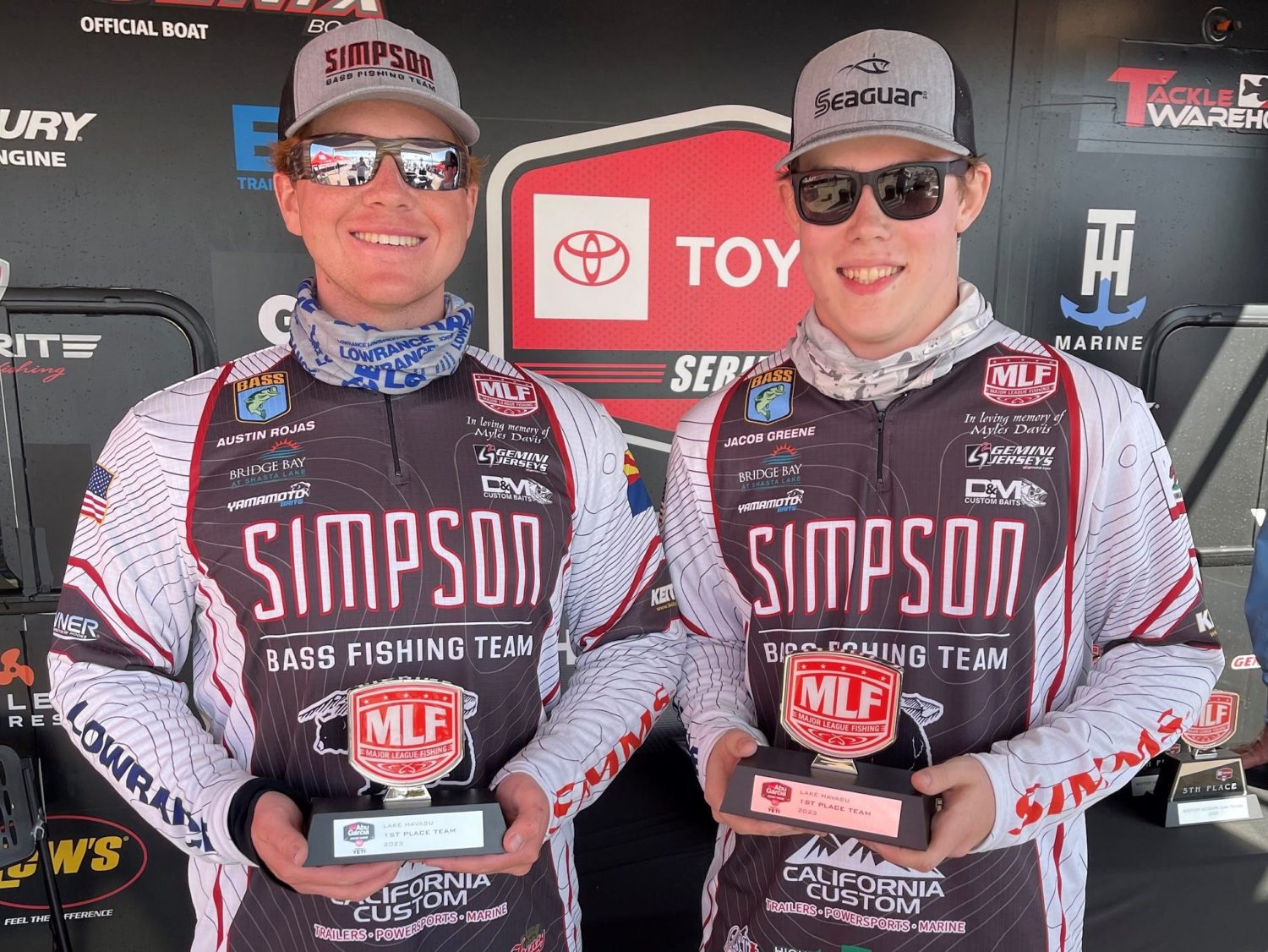 LAKE HAVASU CITY, Ariz. (Feb. 6, 2023) – The Simpson University duo of Jacob Greene of American Canyon, California, and Austin Rojas of Lake Havasu City, Arizona, cruised to victory by more than three pounds at the MLF Abu Garcia College Fishing Presented by YETI event on Lake Havasu Presented by Tackle Warehouse Saturday with a five-bass limit weighing 13 pounds, 10 ounces. The victory earned the Red Hawks’ bass club qualification into the 2024 MLF College Fishing National Championship.