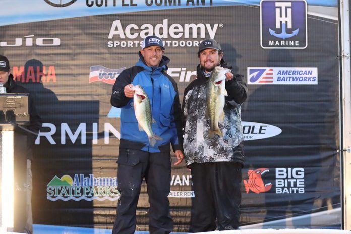 The second-place team of Terry Tucker and Jeremy Green caught one or two small fish during Friday’s practice with a game plan today to just go fishing. “We targeted fish in staging areas. We didn’t really find anyone else doing that. The depth range was anywhere 8-12 feet in the back of pockets. We attacked those areas. We could see them on the graph and kept fishing those areas all day. Today it worked for us. The water clarity was stained, and the water temps were 52-53 degrees. We bounced around and hit about 3 or 4 areas continuing to rotate though them. We caught fish most of the day with a midday lull. The morning bite was good, and we had a limit by 9:00. This is our second year to fish the ABT, and we feel this is the best competition in the south.” They fished the whole day using crankbaits targeting fish on different brands of mid-range crankbaits in a shad patterns. They shared that they are from the Gadsden area and are “really looking forward to the Neely Henry Lake tournament later this year.” For their second-place finish, they weighed in 17.55 and earned $5,000.