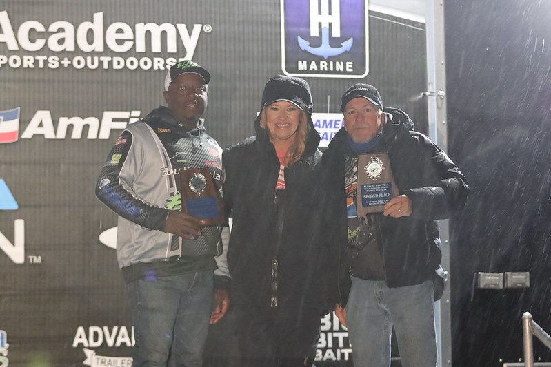 The first-place team of John Kellett and Zeke Gossett caught 17.88 pounds. They spent time in practice “trying to figure them out. With the sunny days in practice, we caught fish a lot shallower than we did today. With the cloud cover and rain, we had to make adjustments. We didn’t catch our first fish till 10:30. We discussed leaving the plan to go and catch a limit and come back but sometimes being hardheaded pays off. We stuck with the plan, and after making the decision to stay, we caught one over 4-pounds and knew we were doing the right thing. We were boat 154 with a 4:30 check-in time. We felt the fish would pull up later in the day, and the late check-in time would help with that. We made the adjustment from the shallower water and felt the fish move out a little deeper. In practice, the fish were in the 1-foot range, but today we found them form 1-12 feet range.  The productive areas for us today were the deeper banks. We would put the boat in 20 feet of water and fish the bank swings. We covered a lot of water, running and gunning looking for those channel swings along the bank. We caught only five keepers today, but they were the five needed. We caught them on a Strike King Rage Swimmer Swimbait Electric shad used a belly weighed hook.”  For the win they collected a $10,000 payday plus a $2000 AmFirst Bonus.