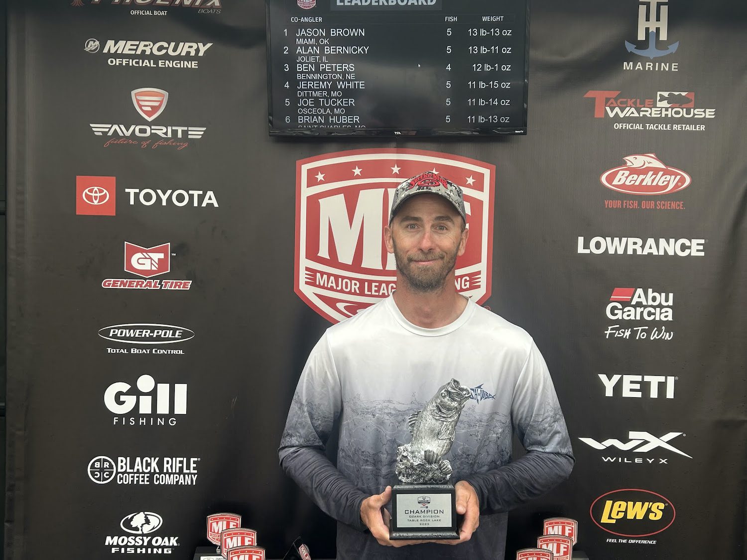 Jason Brown of Miami, Oklahoma, won the Strike King co-angler division and a total of $2,403 Saturday, after bringing five bass to the scale that totaled 13 pounds, 13 ounces.