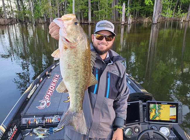 Benton says it was “nuts” up and down Murray’s intermittent rip-rap banks.“There were giant balls of shad everywhere. But some areas were better than others. Anywhere I found shade, I found bass using it as ambush locations to gobble up bait. In particular, I found three points that had trees casting shadows on the water where bass were active. After each time I boated a fish, a new fish would slide up into the same place I casted,” divulges Benton.“In terms of working the Pro Sunny B,” offers Benton, “I was winding the bait as fast as I possibly could without it blowing out. And we’re talking super-fast since I was using an 8:1 reel loaded with 15-pound fluorocarbon on a 7’ medium-power rod. That’s how you had to work it, or the bass would just slap it. Once I figured out the shade and speed thing, it all came together.”After a couple big fish—each caught without any aid of forward-facing sonar—Benton motored back to the creeks that had done him right sight-fishing on days 1 and 2.“Leaving the rip-rap shad spawn bite, I had a little under 20 pounds, and then caught three more off beds, culling up to 27 pounds, which was a pound over my goal of 25 or 26 for the final day.”