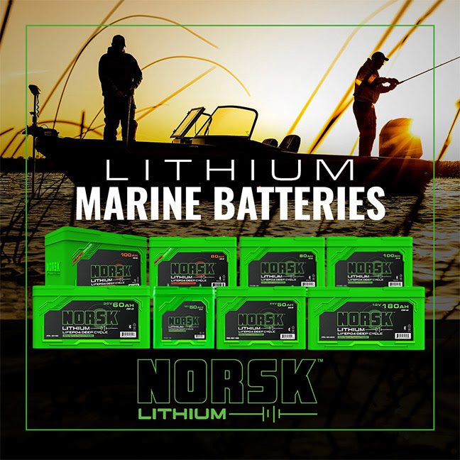 | Gain Boat SpeedGiven the decrease in weight from lead acid or AGM, anglers/boaters who have switched over to lithium batteries report an average boat speed increase in the neighborhood of 2 to 5 mph. Do we recommend you buy lithium batteries for a couple more MPH? We conceded that likely shouldn’t be your primary motivation. But going fast is fun and, given all the other foundational benefits lithium batteries provide, who’s going to turn up their nose at being able to walk away from the competition at the next shotgun start?Lithium: Lighter and More Compact Lithium is also very light in comparison to lead acid, AGM, and gel cell batteries—what typically amounts to about 45% less weight than the similar size group size lead acid or AGM.For example, a NORSK Lithium 100AH battery weighs approximately 25 pounds. A comparable battery would be a 31 series lead acid deep cycle that weighs approximately 60 pounds.Lithium batteries often have a smaller footprint, too, which makes installation in a lot of boats easier. With NORSK’s new advances in starting/deep cycle lithium battery combinations, finding a spot in your boat for a fifth battery (frequently referred to as a “house” battery), is no longer required.NORSK Lithium has done significant testing to design the ultimate starting/deep cycle lithium battery.Company founder and Director of Engineering, Derek A., remarks: “We’ve figured out which cells can deliver that big, quick burst of energy in the shortest period of time to turn over very large outboard engines. We’ve also made sure the internal wiring as well as all the conductive cells can handle that current. Lithium batteries sold as starting batteries up to this point have had significant issues. If you don’t have the proper internal wiring to carry high current, that power surge can melt the terminals right off the top of the battery. It all comes down to managing the resistance, something we’ve been able to do with our new dual-purpose NORSK Lithium starting/deep cycle battery design.”Holst interjects: “We took Mercury’s requirements for a starting battery—the specs that spelled out their stringent guidelines and warranty expectations—and used that as a starting point. We have the absolute best starting battery on the market in our 180Ah Starting + House battery and we added a lot of extra capacity to it so an angler struggling to find space for a “house” battery to power their sonar units doesn’t have to tear their boat apart and give up valuable storage space looking for room for yet another battery. Our 180Ah Starting + House battery performs both roles beautifully and frees up anglers to stop worrying about battery capacity and runtime and just focus on fishing!”Holst continued: “With NORSK Lithium, anglers can uncomplicate things a bit and, in the case of a traditional 36V setup, pare down to three 12V batteries rigged in series for the 36V trolling motor set-up and one dedicated “Starting + House” battery for both your outboard engine and electronics. Our new design has plenty of capacity to run everything all day long. It meets and exceeds Mercury’s warranty requirements for starting batteries, offers up to 1200 cold cranking amps (CCA) and is going to last a long time—10 plus years, easy—or a minimum of 4000-plus discharge cycles. It’s a great solution. Solves two problems with one battery.” |