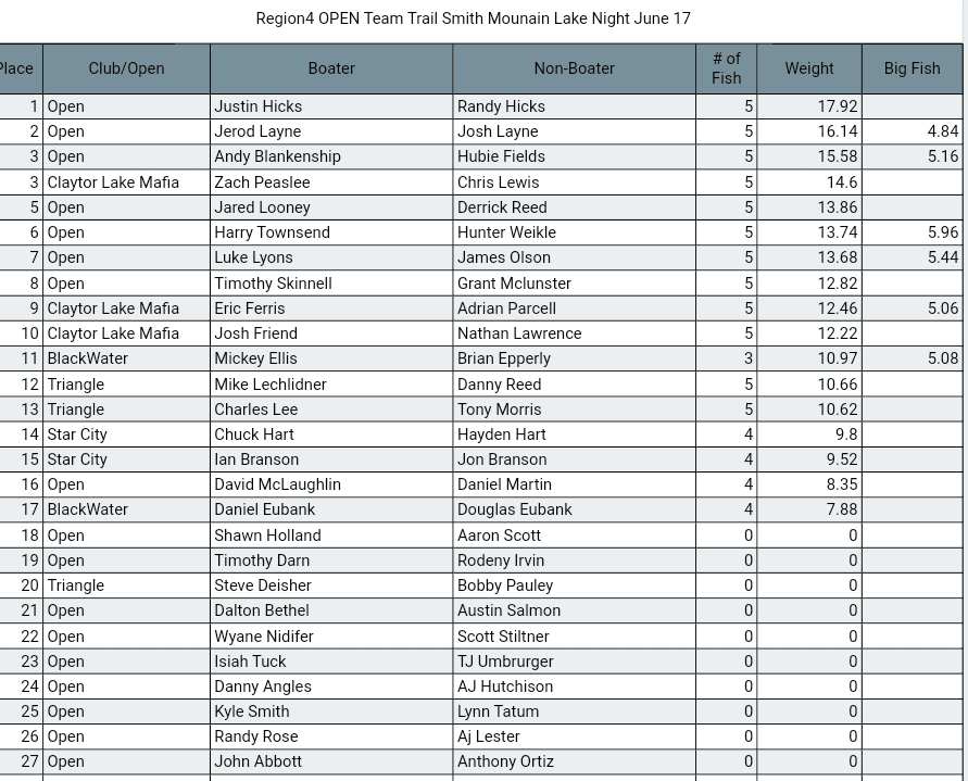 We had 27 teams come out and fish on a very tough June night.