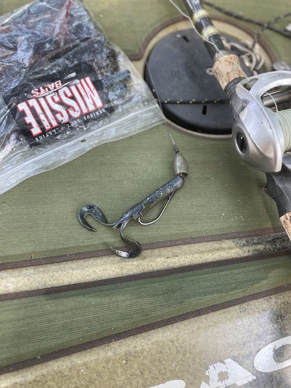 Punching is another fun way to fish matted vegetation. I’ll usually start with a 1 oz weight and go heavier as needed. I try to use the lightest weight that will easily penetrate the canopy. One thing that I do differently from other punchers, I use a relatively light hookset. I’ve found that a jarring hookset isn’t necessary. I still lean into them and try to winch them out of the cover quickly, but I’m not swinging for the fences. I use 50 or 65-pound braided line and an extra heavy 7’6’’ rod. There is very little give in that setup, and my casts are short, usually 10 yards or less. At that range, a jarring hookset can tear a big hole in the fish’s lip, making it easier for the hook to pop out with a head shake. I also think a steady pressure set keeps the big weight from popping the fish’s mouth open, another way we miss fish punching. Like many others, I’ve been using a snell knot on my punching setup for several years. I think the way it makes the hook stand out results in better hookups, but I also caught plenty of fish back when I used a simple palomar knot. When it comes to baits for punching, I keep it simple. A Missile Baits Craw Father in green pumpkin or superbug is my go-to when it’s hot out. It’s a compact lure that slides through the grass more easily than baits with large appendages. It’s also made of durable plastic that doesn’t tear as easily as some others I’ve tried.
