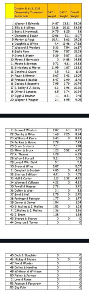 When the scales closed on Sunday afternoon it was the team of Land Weaver and John Edward’s Jr that held on to their day one lead and take home the $5000.00 prize. They are also the Winners of our spring Qualifier at Gaston earlier this year. I guess it’s safe to say them guys are pretty strong on Gaston Lake ?. They brought in a day two bag weighing 13.21 pounds earning them a total of $6225.00 with TWTs. BIG CONGRATULATIONS to them. They definitely earned it. They were followed by the team of Seth Ellis & Doug Stallings with a day two bag weighing 10.12 pounds earning them $1905.00 with TWTs. GOOD JOB guys! Coming in 3rd place was the team of Flash Butts & Shawn Hammock with a day two bag weighing 8.25 pounds earning them $1055.00 with TWTs. Also a Great Job to those guys as well!