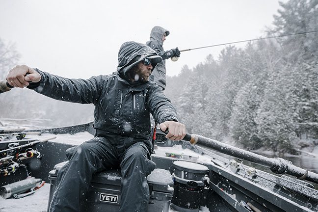 | APPLICATION #1: WALLEYE FISHING“Some walleye anglers are still trolling and vertical jigging sitting down, but what was once a stationary activity has turned into a very active casting game with the advent of forward-facing sonar. More walleye anglers are moving around the boat and fishing from the bow—and spot & stalk casting to fish what they see on their screen. That’s a lot of movement—and our garments cater to that style of contemporary fishing,” notes Ambur. Ambur and legendary NEXT BITE host and walleye pro, Gary Parsons, were just discussing the needs of today’s walleye angler: “Not only do our garments provide mobility and ability, Gary brought up that they’re well-articulated, which is important because today’s anglers are moving their arms and legs all the time and there’s a lot of energy being spent, which has been restricted in foul weather suits of the past, many of which were bulky and stiff. Our suits create less friction and hence less fatigue, which results in an angler being able to fish longer in poor conditions.”Previously, anglers were forced to choose toughness over comfort. Now, integrating stretch into the equation, Whitewater apparel is a paradigm shifter that provides anglers the best of all worlds. “Having tested every foul weather fishing suit out there, I was frustrated with the experience. It’s kind of like owning a 1-ton truck. They have great suspensions and are beasts, but they’re built for one mission in mind. Foul-weather fishing gear has been that 1-ton truck. We sought to design that fishing vehicle that has the durability and toughness of a 1-ton, but with ease of movement, agility, 100% waterproof performance, and a great weight-to-warmth ratio,” adds Ambur. |
