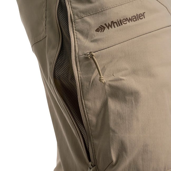 | Like all Whitewater creations, it begins with the fabric. “We nailed the stretch,” said Whitewater president Aaron Ambur. The Prevail Pant’s advanced 4-way stretch, nylon/spandex twill fabric is infinitely comfortable and gives with you every move, not constricting while kneeling or sitting like pants using traditional woven materials. Featuring a modern cut – not stiff and boxy – the Prevail Pant offers fabric-features beyond providing an optimal range of motion. The stretchy nylon/spandex material has exceptional moisture-wicking properties, too, drying quickly and breathing when it’s hot and steamy above board. Moreover, the material is treated with an antimicrobial to combat odors even after hours of wear. Whitewater also added UPF 50 potency to defy unwanted sunrays for maximum sun protection. |