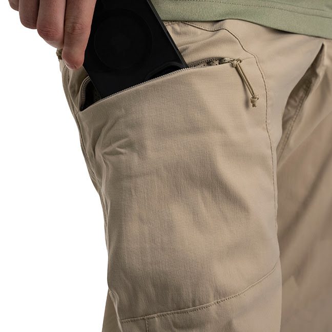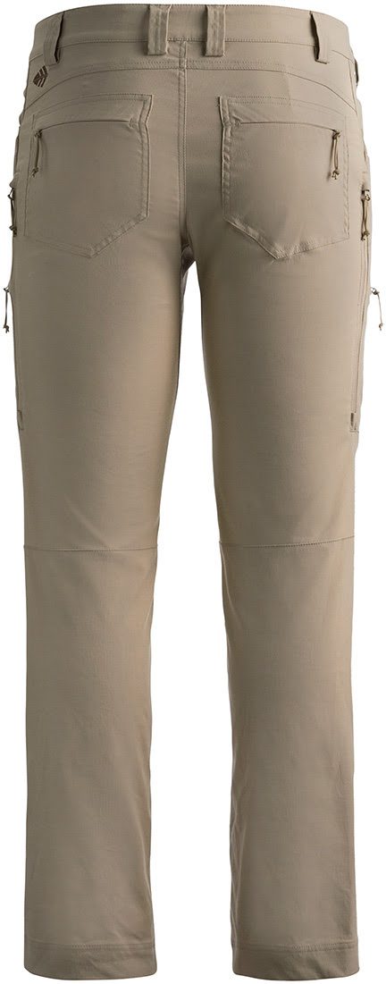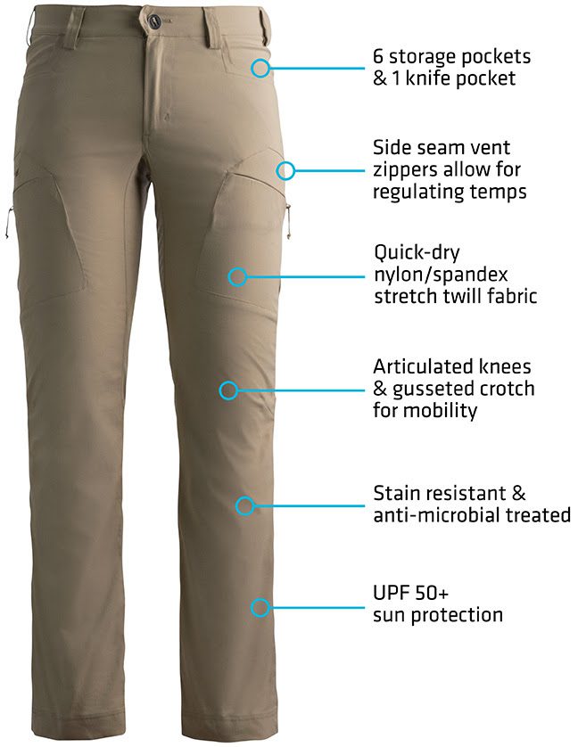 | Prevail Pant DETAILS: Quick-dry nylon/spandex stretch twill fabric UPF 50+ sun protection Stain resistant Antimicrobial treated 7 pockets: 2 front waist, 2 thigh zip, 2 back zip, 1 knife pocket Side seam vent zippers allow for temperature regulation Articulated knees & gusseted crotch for mobility Available in Charcoal and Khaki SIZES: 32R – 42R MSRP $99.99 |