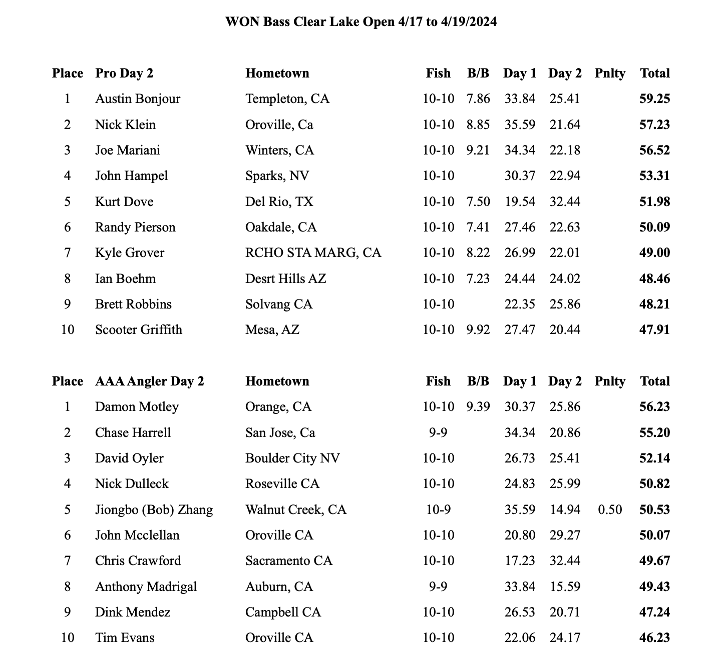 WON Bass Clear Lake Open 4/17 to 4/19/2024