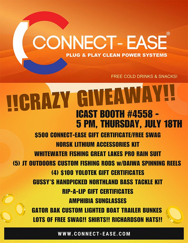 | Also, plan to be present at the Connect-Ease booth at 5 pm on Thursday, July 18, for complimentary beverages and snacks, as well as a spectacular giveaway that includes: $500 Connect-Ease gift certificate/FREE Connect-Ease swag Norsk Lithium battery gift certificates Whitewater Fishing Great Lakes Pro Rain Suit (1) gift certificate for JT Outdoors custom fishing rod JT Outdoors swag (shirts, hats, water bottles) Premium DAIWA reel and line (included with JT Outdoors rod) (4) $100 YOLOtek gift certificates Northland Fishing Tackle Premium, Gussy-handpicked Bassmaster Classic Bass Fishing Tackle Kit, long-sleeve sun-shirt, and Richardson 112 hat RIP A Lip Gift Certificates Amphibia Sunglasses Gator Bak Custom Lighted Boat Trailer Bunks And many more items from Connect-Ease friends & partners! |