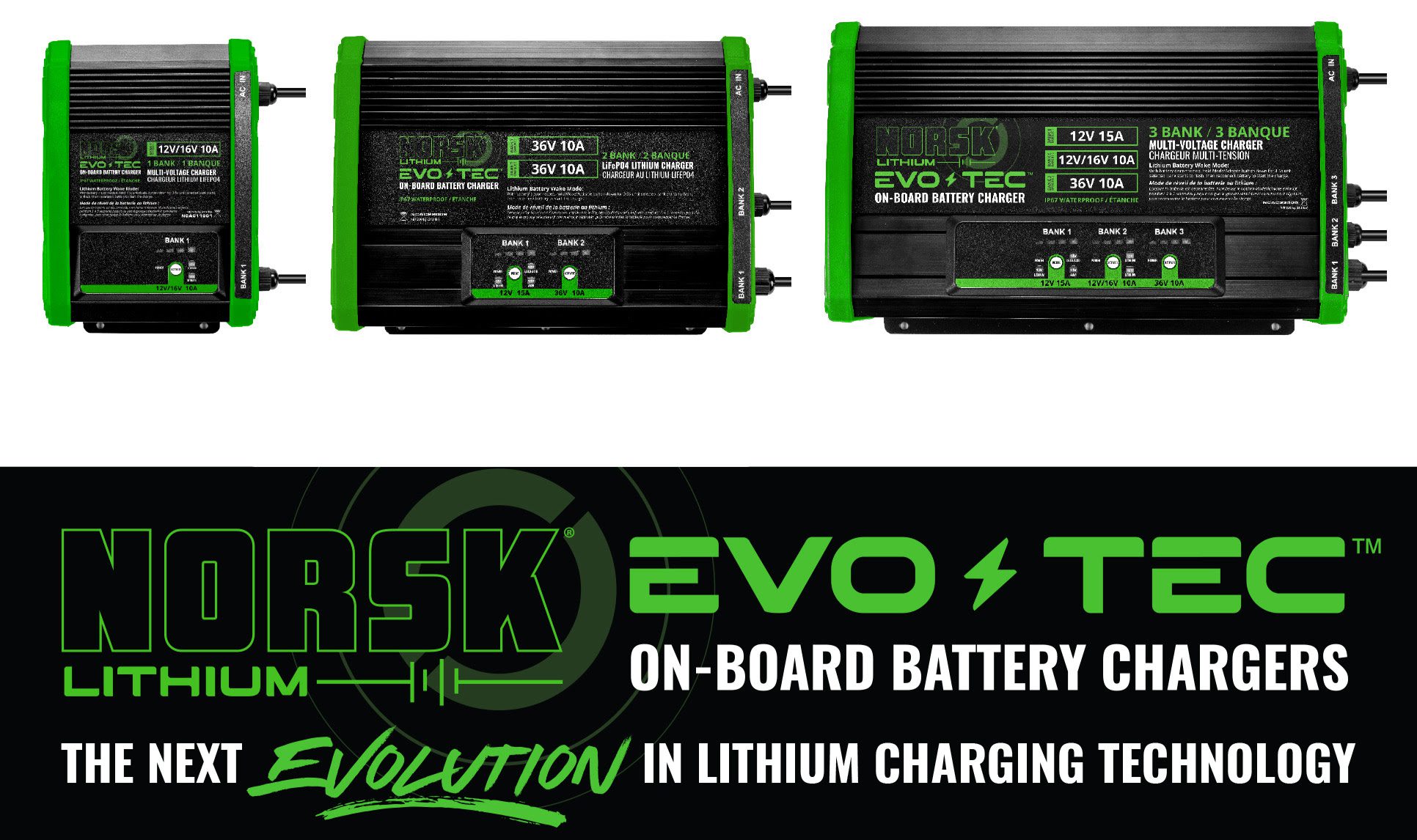 What’s a great battery without the perfect charger?Norsk Lithium is also excited to offer its customers a reliable and problem-free onboard battery charger designed specifically around Norsk Lithium batteries. Norsk Lithium EVO-TEC™ On-Board Chargers are available for all the aforementioned 16V batteries to further optimize their performance. Nine models are currently available in 1-, 2-, and 3-bank configurations that support 12V, 16V, 24V and 36V Norsk Lithium batteries.The new line of EVO-TEC™ On-Board Chargers represents the next evolution in charging technology from Norsk Lithium. With unparalleled multi-voltage charging capabilities, these chargers seamlessly cater to both contemporary LiFePO4 Lithium and conventional chemistries like AGM and Lead Acid. This innovation heralds a new era of efficiency and reliability in marine charging solutions, offering users the flexibility to select the perfect charger regardless of chemistry or voltage.