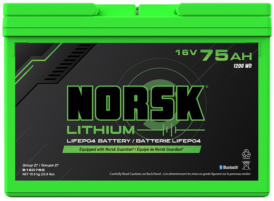 75AH 16V Battery Type: Lithium Iron Phosphate (LiFePo4) Rated Voltage: 16V Max Continuous Current: 75A BCI Compliant Case: Group 27 Weight: 23.8 lbs. Size: 12.04 X 6.81 X 8.85 inches Lifespan: 4,000+ Cycles, Est. 15-20 years Warranty: 10 Year + 2 with Norsk Guardian® Bluetooth®, Deep Sleep™, MAX RT MAP $649.99AVAILABLE FALL 2024