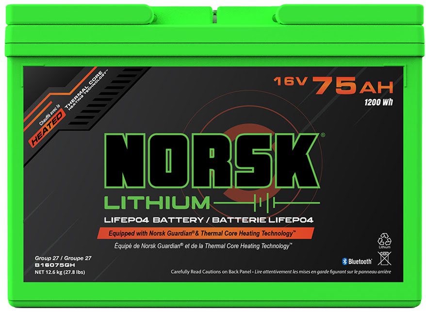 75AH 16V Heated Battery Type: Lithium Iron Phosphate (LiFePo4) Rated Voltage: 16V Max Continuous Current: 75A BCI Compliant Case: Group 27 Weight: 27.8 lbs. Size: 12.04 X 6.81 X 8.85 inches Lifespan: 4,000+ Cycles, Est. 15-20 years Warranty: 10 Year + 2 with Norsk Guardian® Bluetooth®, Deep Sleep™, MAX RT MAP $749.99AVAILABLE FALL 2024