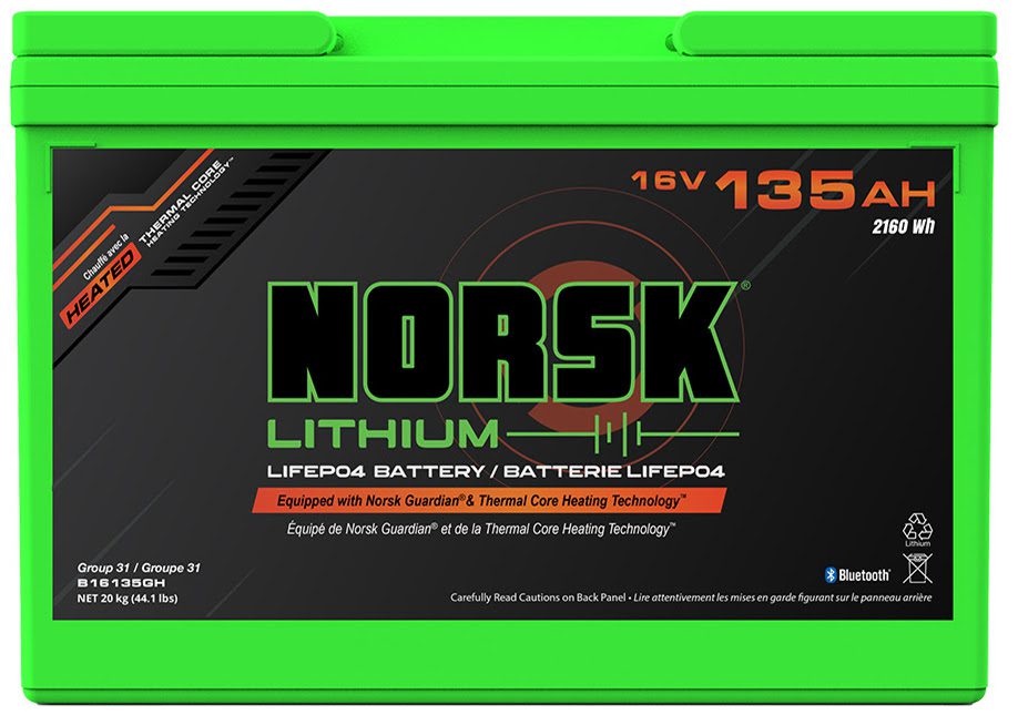 135AH 16V Heated Battery Type: Lithium Iron Phosphate (LiFePo4) Rated Voltage: 16V Max Continuous Current: 135A BCI Compliant Case: Group 31 Weight: 44.1 lbs. Lifespan: 4,000+ Cycles, Est. 15-20 years Warranty: 10 Year + 2 with Norsk Guardian® Bluetooth®, Deep Sleep™, MAX RT MAP $1,149.99AVAILABLE FALL 2024