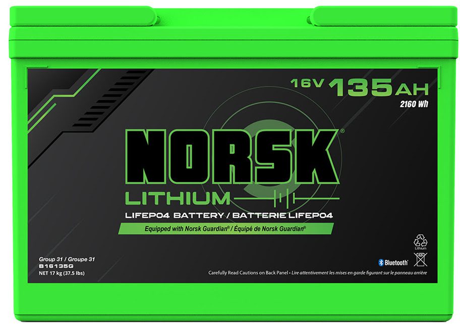 135AH 16V Battery Type: Lithium Iron Phosphate (LiFePo4) Rated Voltage: 16V Max Continuous Current: 135A BCI Compliant Case: Group 31 Weight: 37.5 lbs. Size: 13 X 6.81 X 9.25 inches Lifespan: 4,000+ Cycles, Est. 15-20 years Warranty: 10 Year + 2 with Norsk Guardian® Bluetooth®, Deep Sleep™, MAX RT MAP $1,049.99AVAILABLE FALL 2024