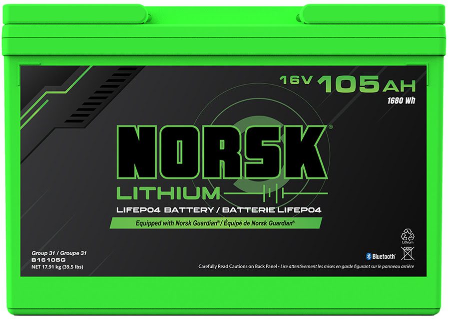 105AH 16V Battery Type: Lithium Iron Phosphate (LiFePo4) Rated Voltage: 16V Max Continuous Current: 105A BCI Compliant Case: Group 27 Weight: 30.9 lbs. Size: 12.04 X 6.81 X 8.85 inches Lifespan: 4,000+ Cycles, Est. 15-20 years Warranty: 10 Year + 2 with Norsk Guardian™ Bluetooth®, Deep Sleep™, MAX RT MAP $849.99AVAILABLE FALL 2024