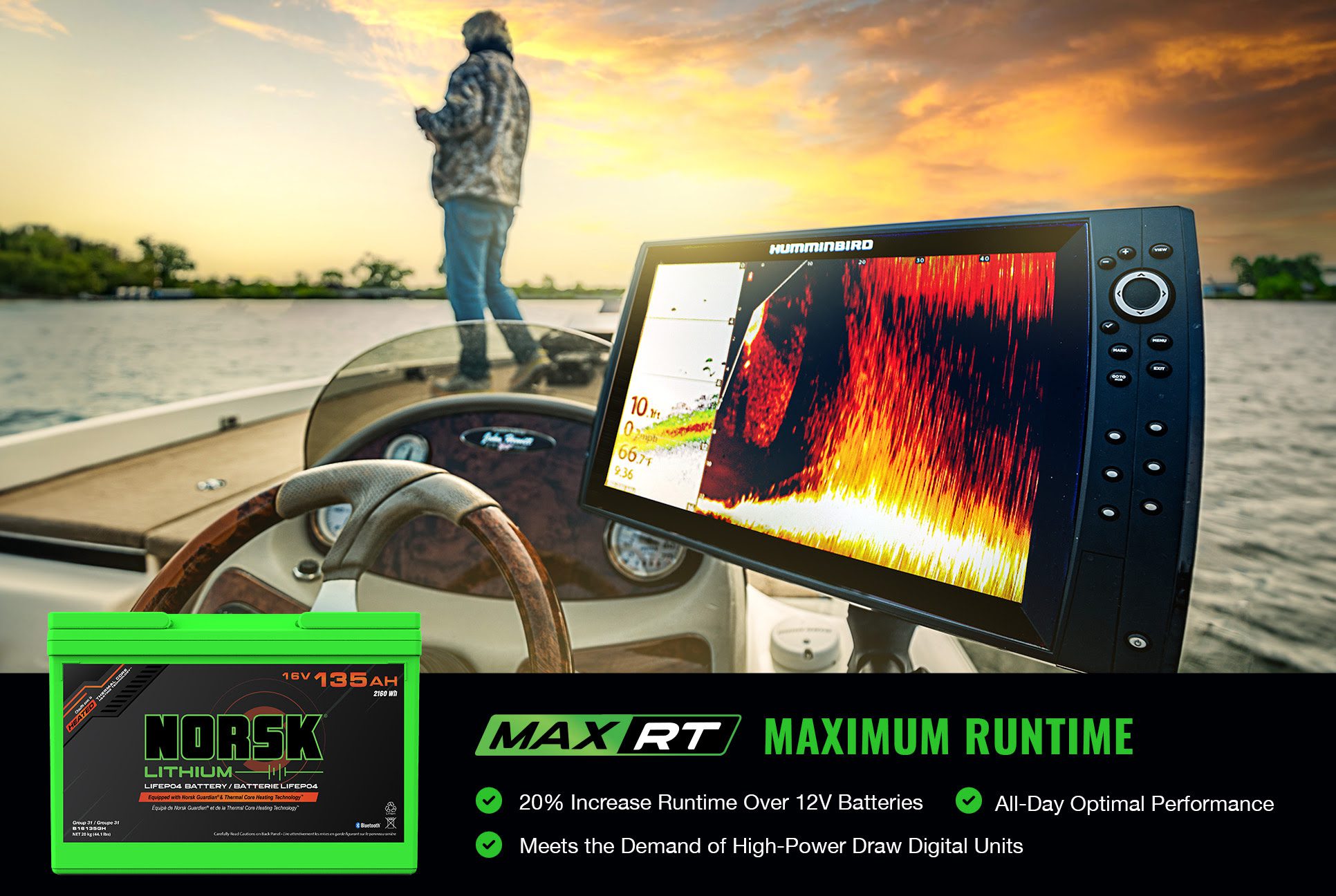 New Hope, Minn. (July 12, 2024) – As of summer 2024, you will find that most serious anglers are using large graph screens and forward-facing sonar. But eavesdrop at your local bait shop or marine dealer and you’ll find many are experiencing serious issues with power—everything from problematically short runtimes to overall performance of their sonar equipment that falls short of expectations considering the investment.The solution? Norsk Lithium’s new line of 16V MAX RT batteries meet the demand of high-power draw digital units and offers all-day, optimal performance. With MAX RT, anglers get a 20% increase in runtime and lower amperage draws versus 12V batteries. Norsk Lithium 16V MAX RT batteries are a single-battery solution that provides all-day runtimes for large sonar screens and forward-facing sonar.