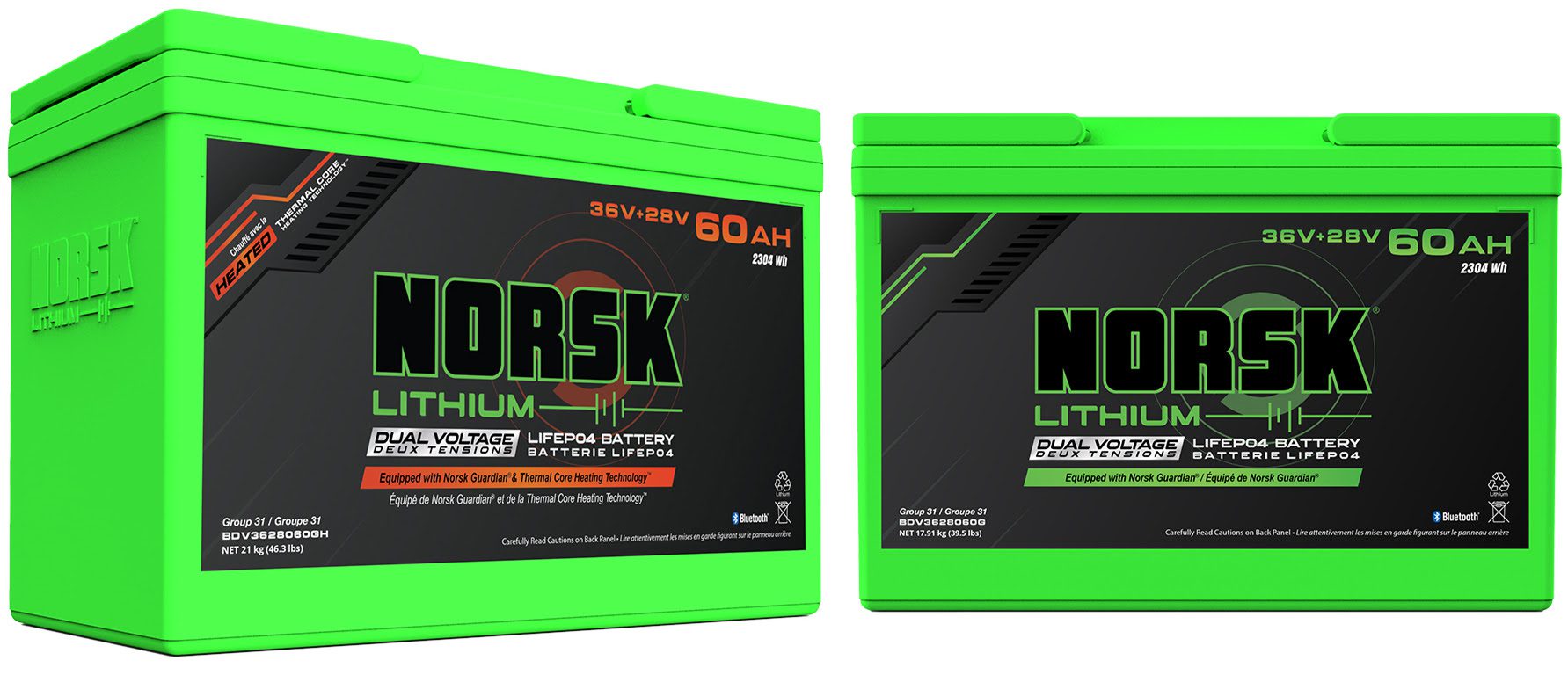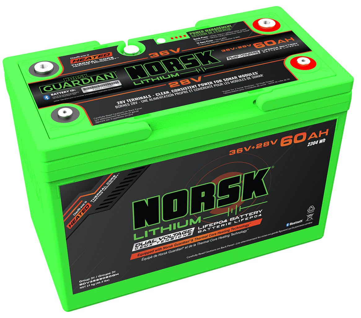 | The new line of Norsk Lithium® 36+28V 60Ah batteries boast two sets of terminals, offering dual voltage functionality within a single package – providing enhanced trolling with clean, consistent power to maximize the performance of your forward-facing sonar modules to achieve the crisp and interference-free images modern anglers demand. |