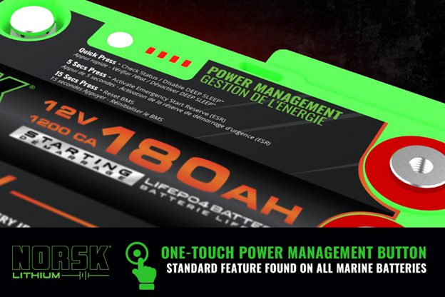 “Instead of anglers having to dig out a jump pack that all too often gets left at home, to eliminate the chance that the starting battery can be so deeply discharged that there’s not enough juice left to start the outboard, we built in an Emergency Start Reserve (ESR) right into our new line of starting batteries. 25% of the battery’s capacity is set aside, almost like an internal starting pack that you’ll never forget on the kitchen counter, so the angler can avoid ever being caught on the water or at the landing with a dead starting battery ever again! To access the Emergency Start Reserve you have the option to do so in the Norsk Guardian™ App or by pressing and holding the Battery Management button for 5 seconds. With the touch of a button you go from being dead on the water to running across the lake with the wind in your hair! With our new batteries, an angler will never get caught by surprise on the water with a dead starting battery.”