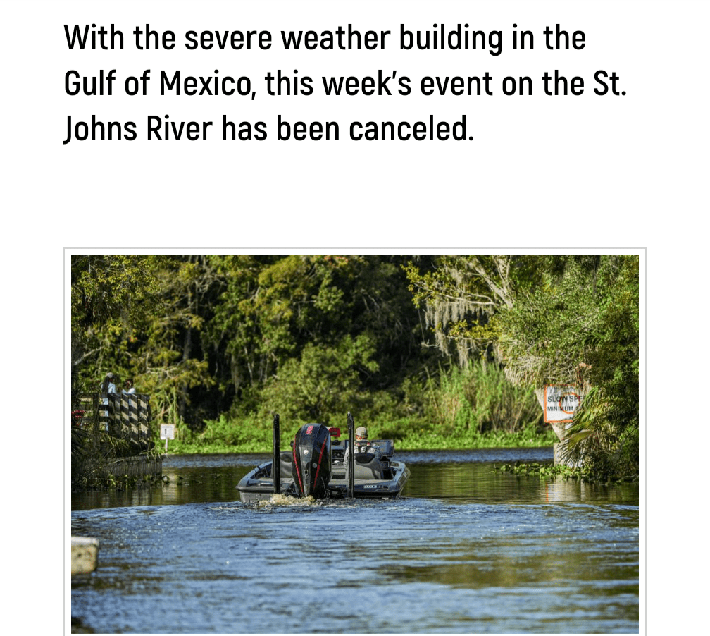 “Our commitment is to the safety and well-being of our anglers,” said NPFL president Brad Fuller. “We take that commitment very seriously and believe that the forecasted weather presents a threat that’s too great to risk.”