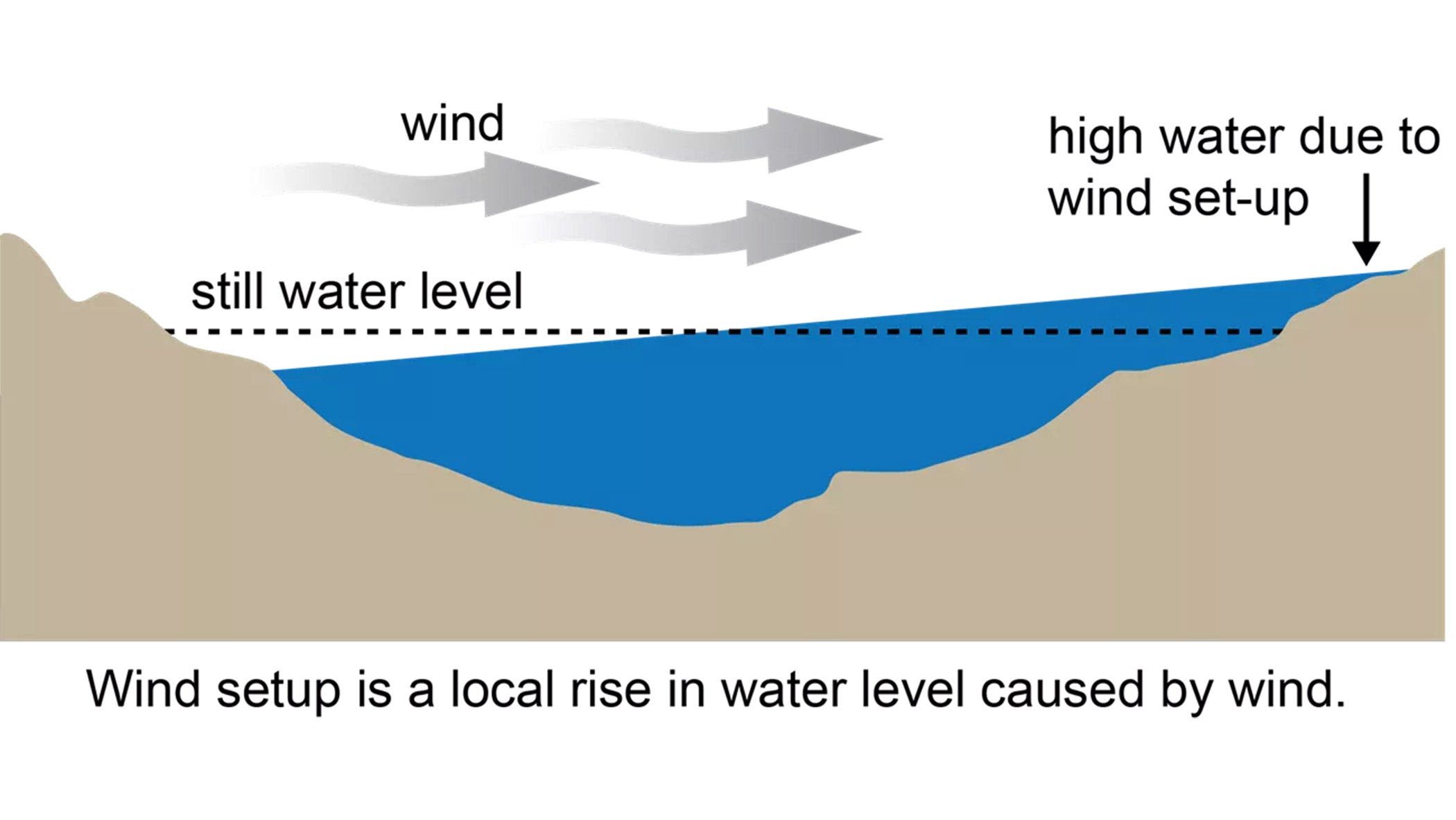 | A seiche (pronounced “saysh”) is a disturbance or water oscillation in an enclosed or semi-enclosed body of water like a lake. Seiches are often caused when strong winds push water from one end of the body of water to the other. They can also occur with strong changes in atmospheric pressure. Seiches are particularly common in Lake Erie, especially when strong winds blow from southwest to northeast. Seiche events now usually happen every 1-2 years on Lake Erie, causing localized flooding and intense erosion. Learn more about seiches here. |