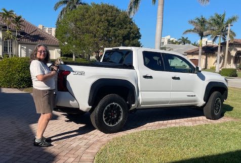 | MLF Bass Pro Shops and Toyota Sweepstakes winners Mary Schabdach of Marco Island, Florida, showing off her 2024 Toyota Tacoma and Walter James of Braselton, Georgia, holding up the key to his 2025 Nitro Z19. |