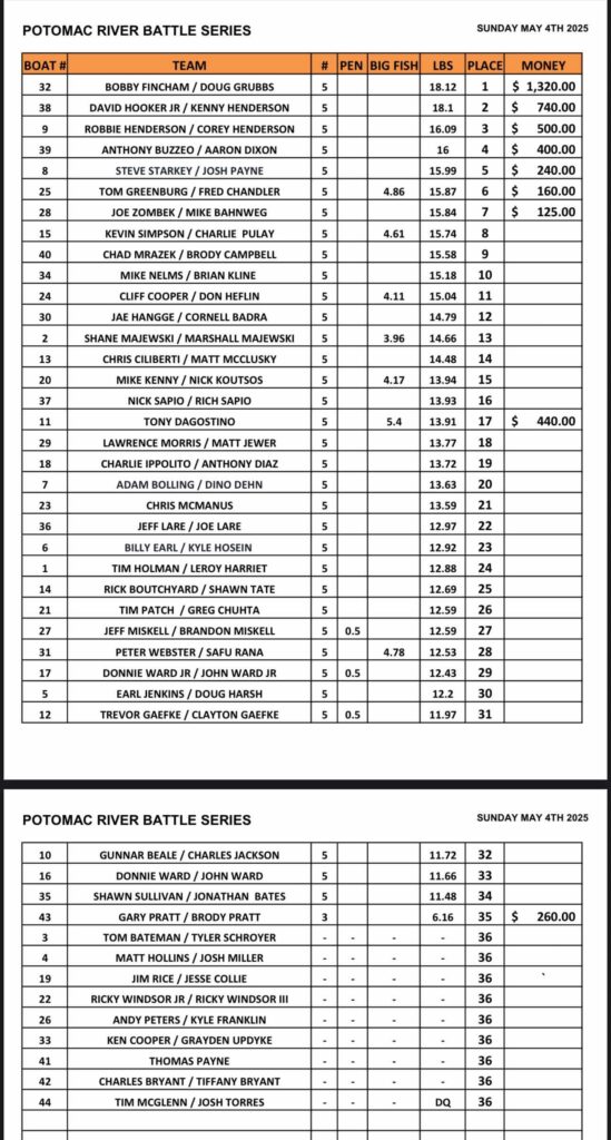 Congratulations to Bobby Fincham & Doug Grubbs for winning the Potomac River Sunday Series Event today! They dropped 18.12lbs on the scales on a rough day! They are back on their home turf and cashing checks!! They took home $1320.00 for their effort today…