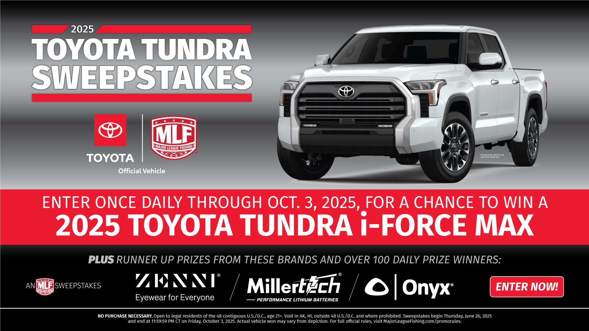 | After a few days with his new 4Runner, Cath has been appreciating all the smart features that come standard. “It’s like a spaceship,” he said. “It does just about everything except catch the fish for me.” But beneath the jokes is real gratitude. “I’ve never owned a vehicle this nice. I’m really thankful to Major League Fishing and Toyota. This has been a highlight of my life.” Your Turn to Ride Now it’s someone else’s turn to live out the dream. Major League Fishing and Toyota are proud to announce the MLF Toyota Tundra & More Sweepstakes, launching June 26, 2025. One lucky winner will take home the ultimate outdoor adventure machine – a 2025 Toyota Tundra Limited i-FORCE MAX, a truck built for both the workweek and the weekend outdoors. And that’s not all: Three runner-up prize packages from top MLF partners like MillerTech, Onyx, and Zenni 100 daily prizes including coolers, gift cards, fishing gear, and even autographed jerseysFans can enter daily at majorleaguefishing.com/promos from June 26 through October 3, 2025. If Ian Cath’s story proves anything, it’s that these sweepstakes are real, winnable, and potentially life-changing – whether you’re a bass fishing fanatic or just someone who could use a little luck and a lot more horsepower. So what are you waiting for? “Go for it,” Cath said. “Somebody’s got to win. It might as well be you!” |